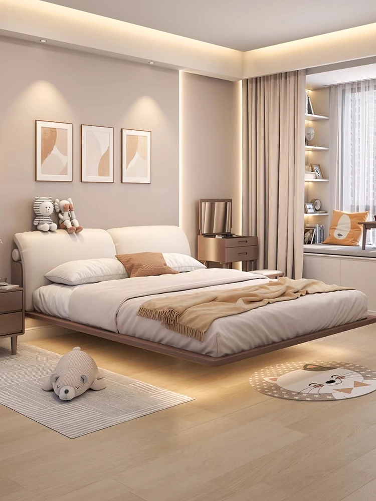浮遊感のある無垢材ベッド|モダンでシンプルな主寝室用ダブルベッド|経済的なイタリアンミニマルスプリングフレーム|和風家具|おしゃれで快適な眠りを実現する理想の一台!