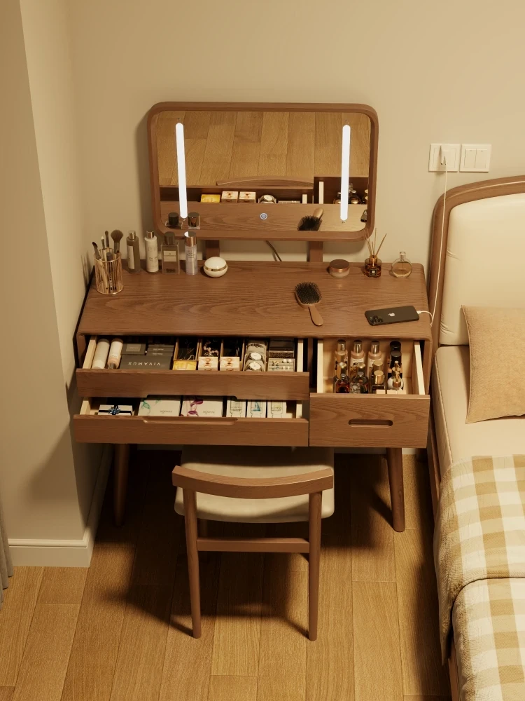 シンプルでモダンなデザインの無垢材ドレッシングテーブル|小スペースに最適な収納コンパクト化粧台|主寝室や書斎にもぴったり!あなたの美しさを引き立てる特別な空間を演出します。
