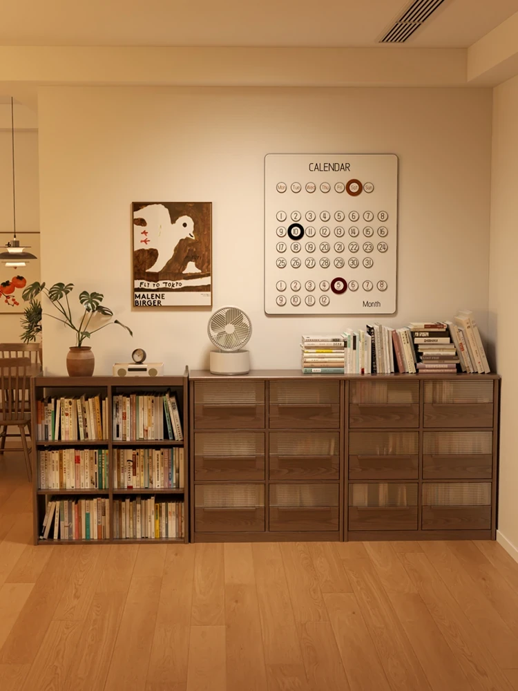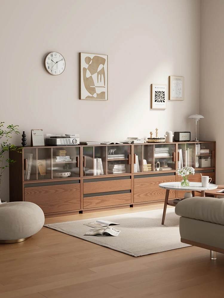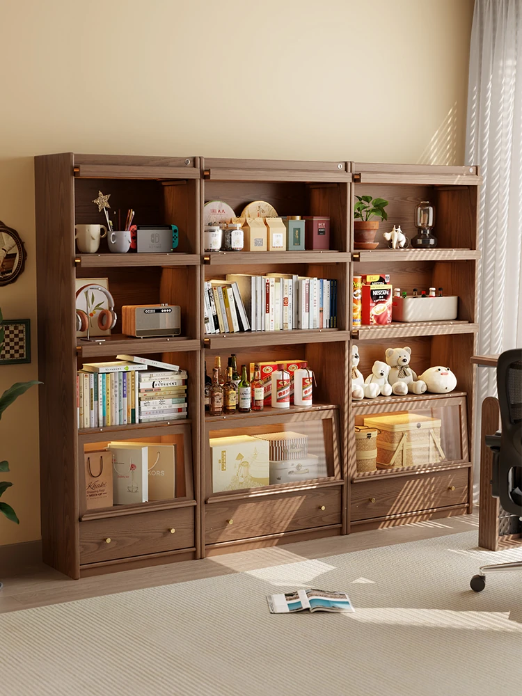 天然木材使用!全一体整墙デザインの防塵ガラス扉付き書棚|家族の雑誌や小物を美しく収納できる、おしゃれで機能的な展示収納ラック|フロアタイプのクールな書庫!