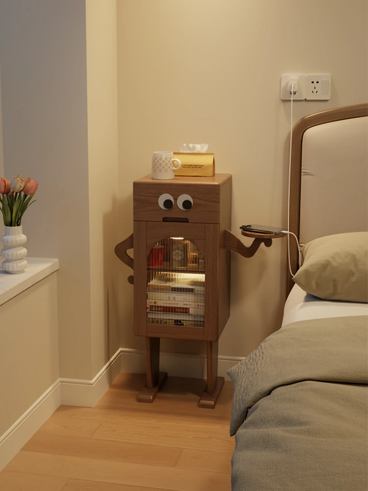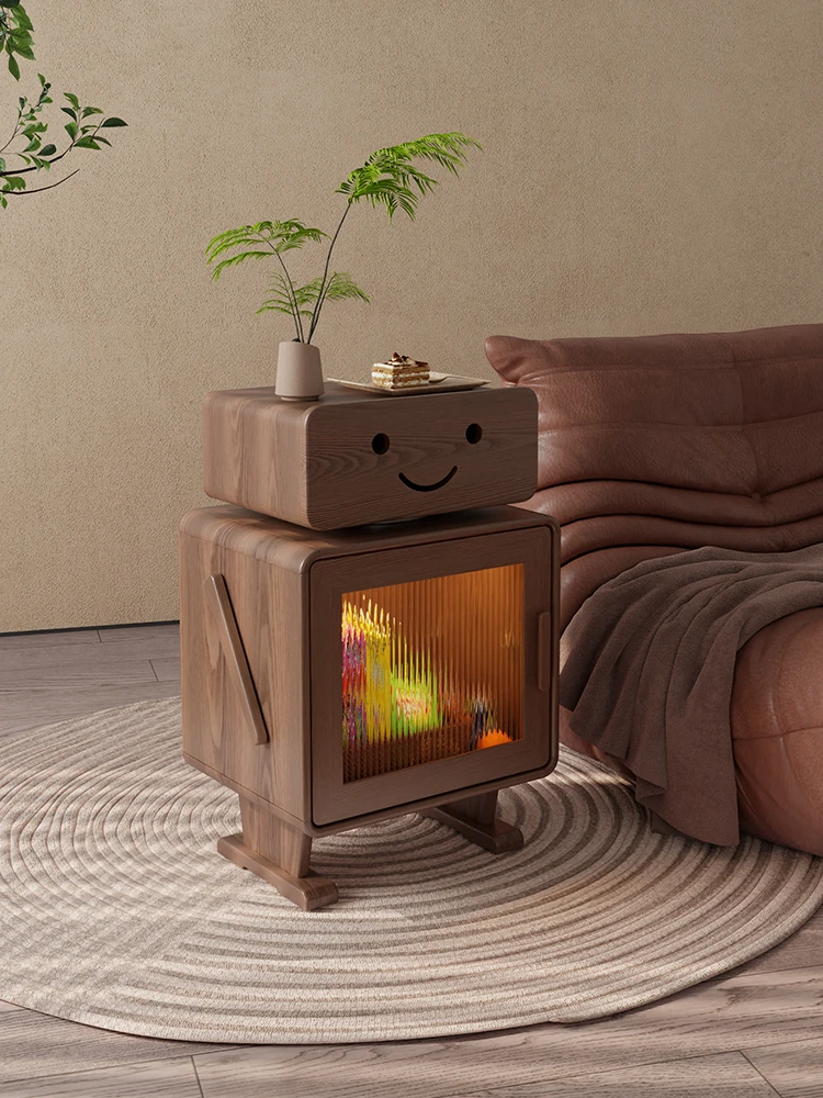 ロボットデザインのナイトテーブル - ライト付きのナチュラルウッド製、ソファサイドテーブルやリビングルームのキャビネットに最適な、クリエイティブな子供用ベッドサイドキャビネット。快適な暮らしをサポートします!