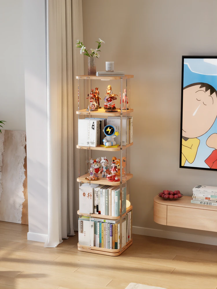 360度回転アクリル書棚|リビングにぴったりのスタイリッシュな展示キャビネット|地面に置ける収納ラック|テレビボードの隣に最適|高品質な無垢材の書棚で、おしゃれな空間を演出!