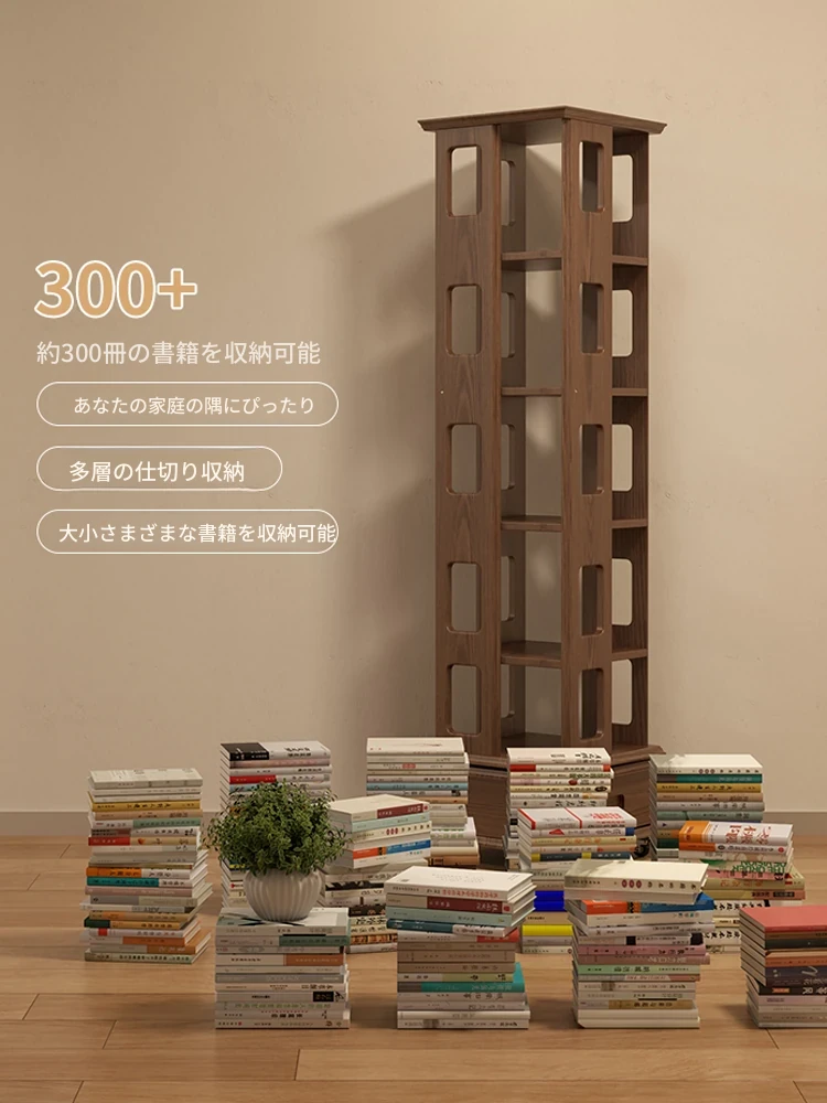 天然木材を使用した360度回転書棚!子供向けの絵本も収納できる、家庭用の移動式ラックで、リビングにぴったり。おしゃれで機能的なフロア収納ラックで、どんなお部屋にもマッチします!