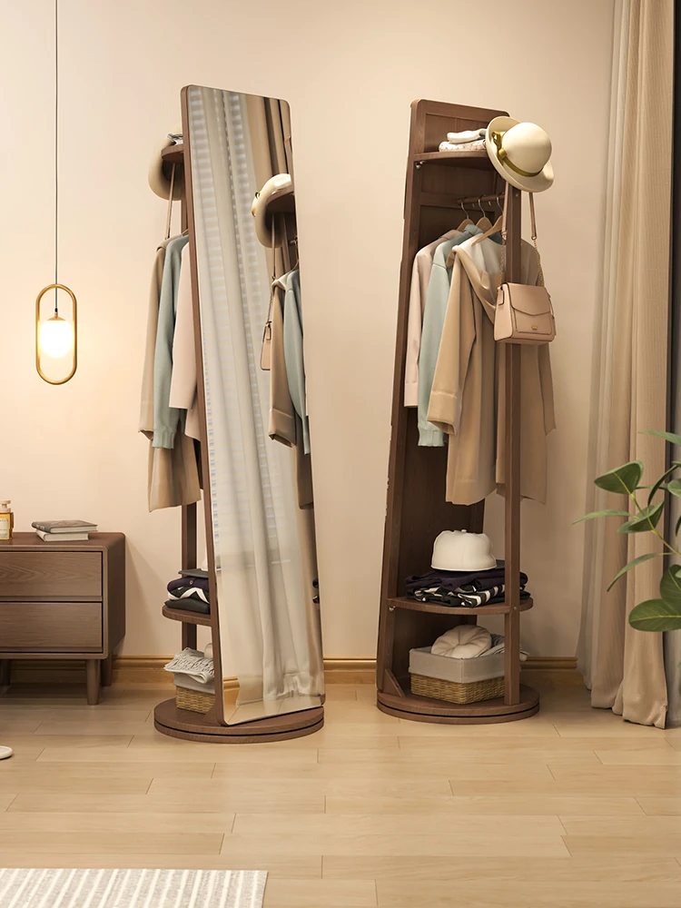回転式コートハンガー 鏡付き スタイリッシュな立て掛け型 リビングや寝室に最適!移動可能な天然木製の収納棚で、あなたの生活空間をおしゃれに演出します。