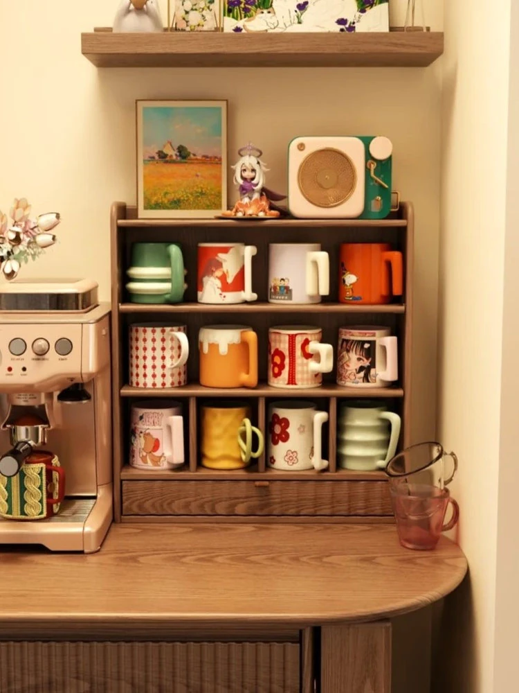 無垢材のカップラック - コーヒーカップやマグカップの収納に最適!デスクやキッチンの壁にぴったりのスタイリッシュなディスプレイラック。おしゃれで機能的な収納で、毎日の生活を彩ります。