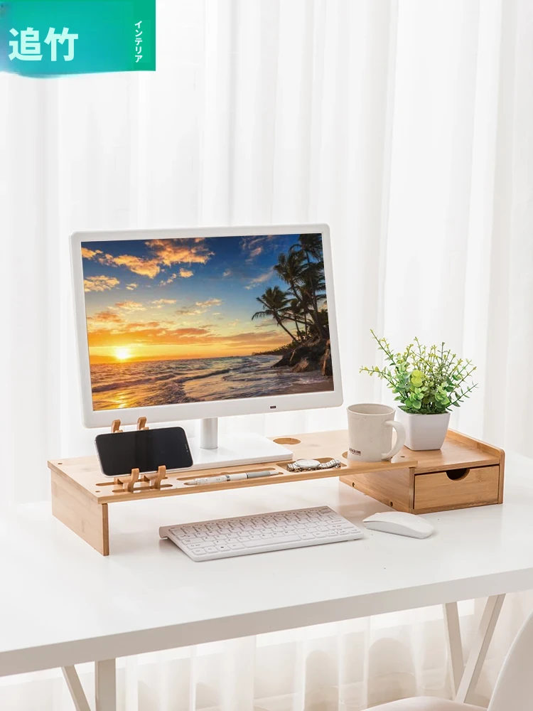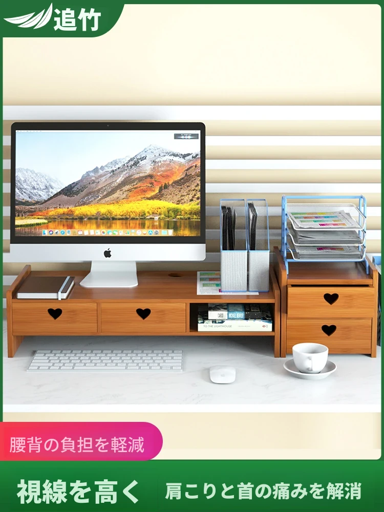 デスクトップ用モニター昇降スタンド - おしゃれな天然木素材で快適な姿勢をサポート!オフィスや自宅に最適な収納ソリューション!デスク周りをスッキリ整理し、作業効率をアップ!