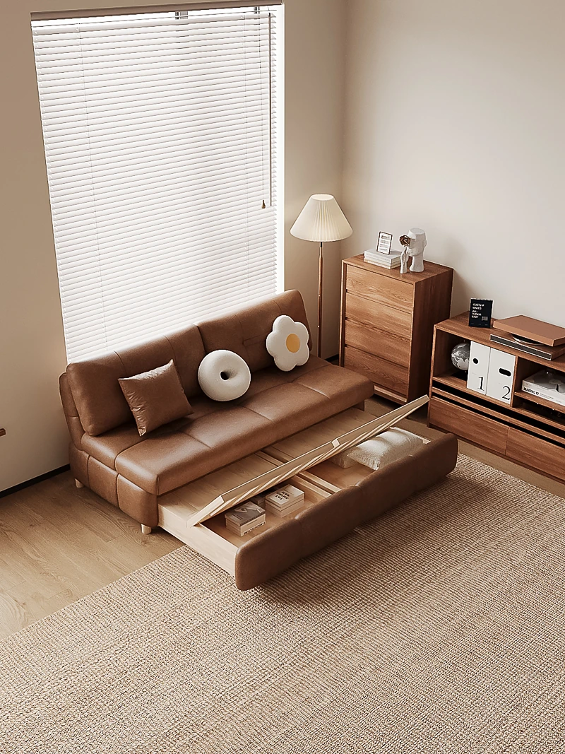 Solid Wood Pull-Button Oil-Waxed Leather Sofa Bed – Multi-Functional, Foldable, Space-Saving Design for Small Homes, Perfect for Both Regular and Guest Use!