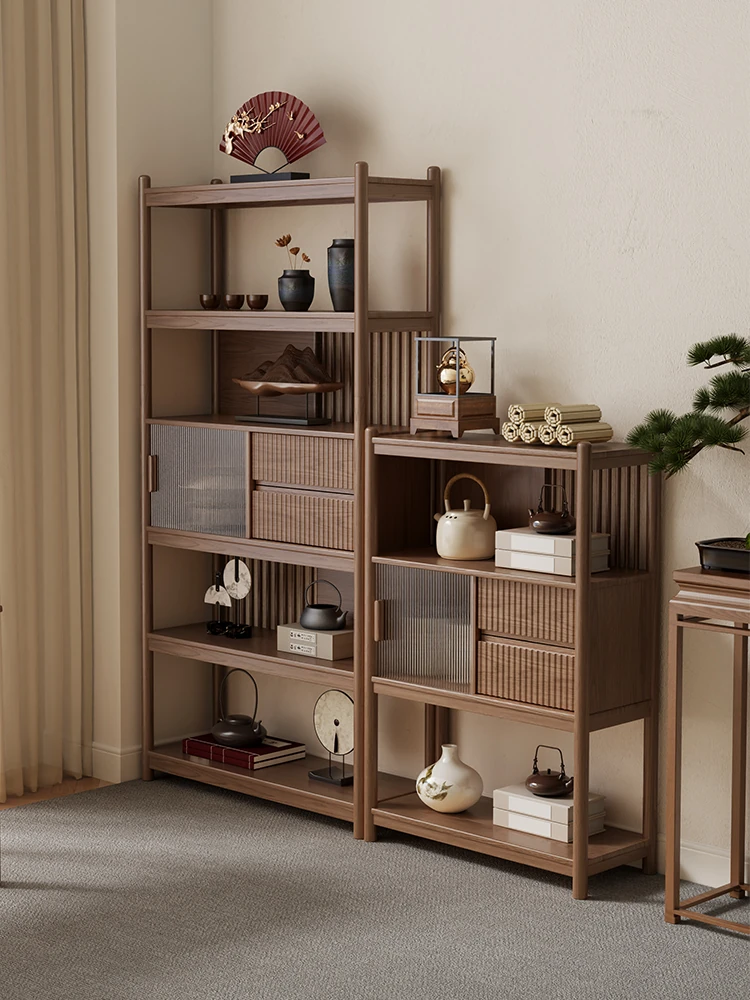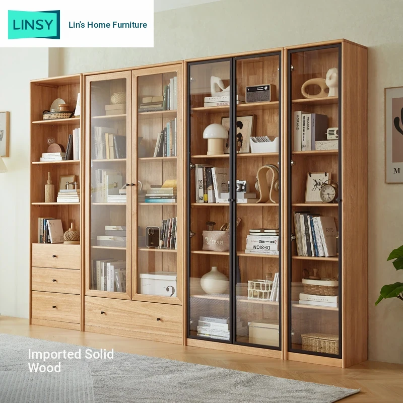 Linsy Nordic Solid Wood Bookshelf – Elegant Full Wall Display Cabinet with Glass Doors for Living Room and Home Office, Perfect for Book Lovers and Stylish Interiors – Model PK1X