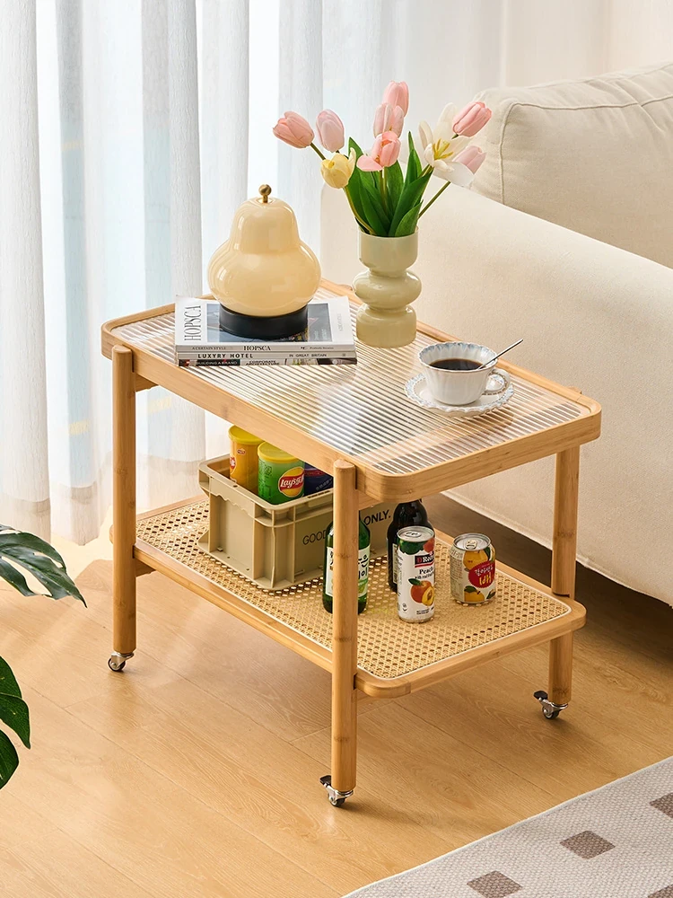 Japanese Style Glass Rattan Wood Side Table – Stylish Mobile Tea Cart & Storage Shelf, Perfect for Balconies and Living Rooms
