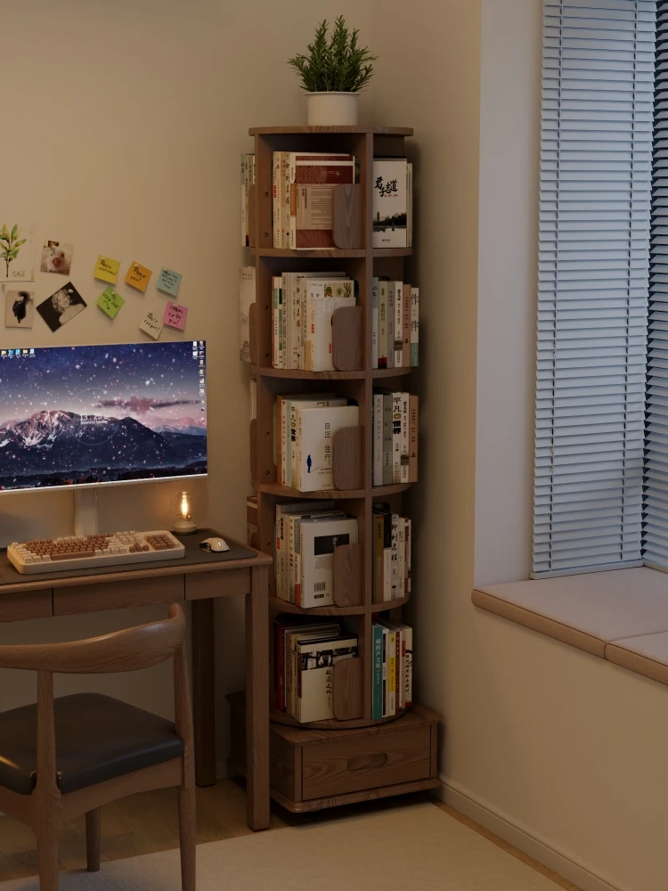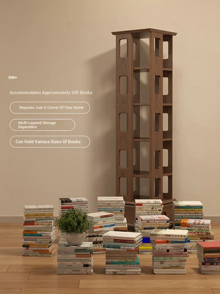 Wooden Rotating Bookshelf - 360-Degree Movable Book Cabinet for Kids, Corner Design, Wall-Mounted Floor Storage Rack for Living Room, Stylish and Functional Home Organization Solution.