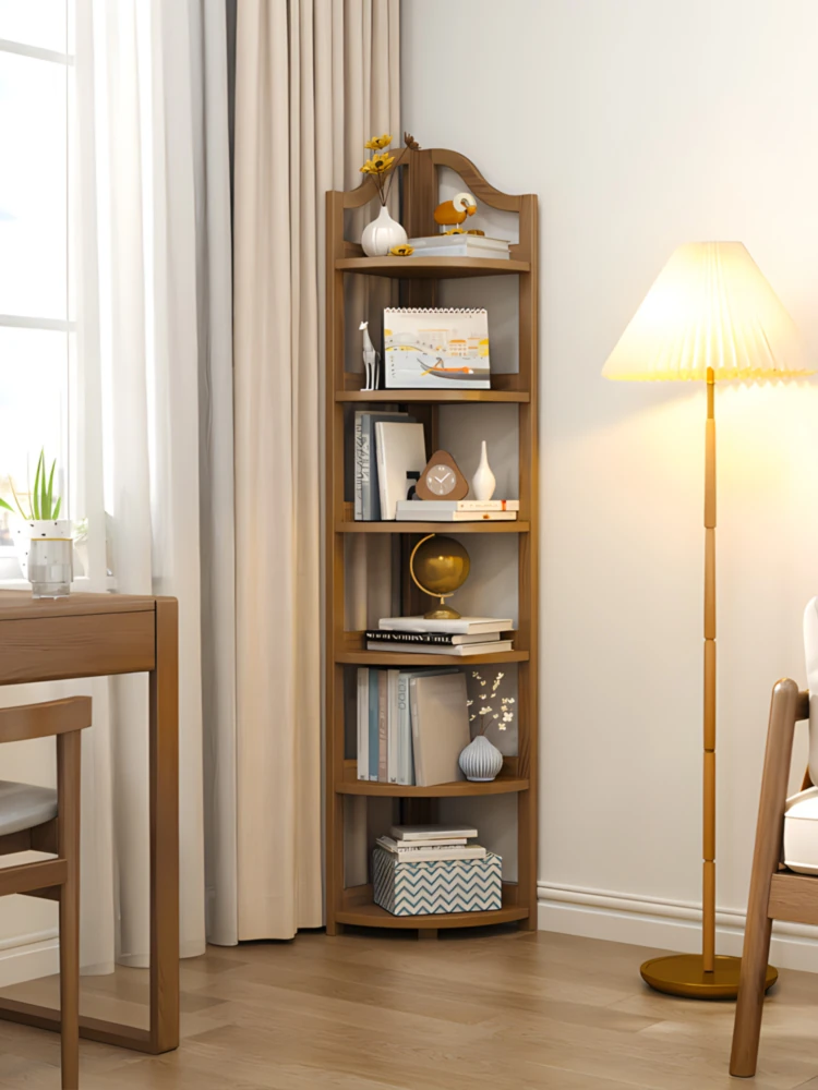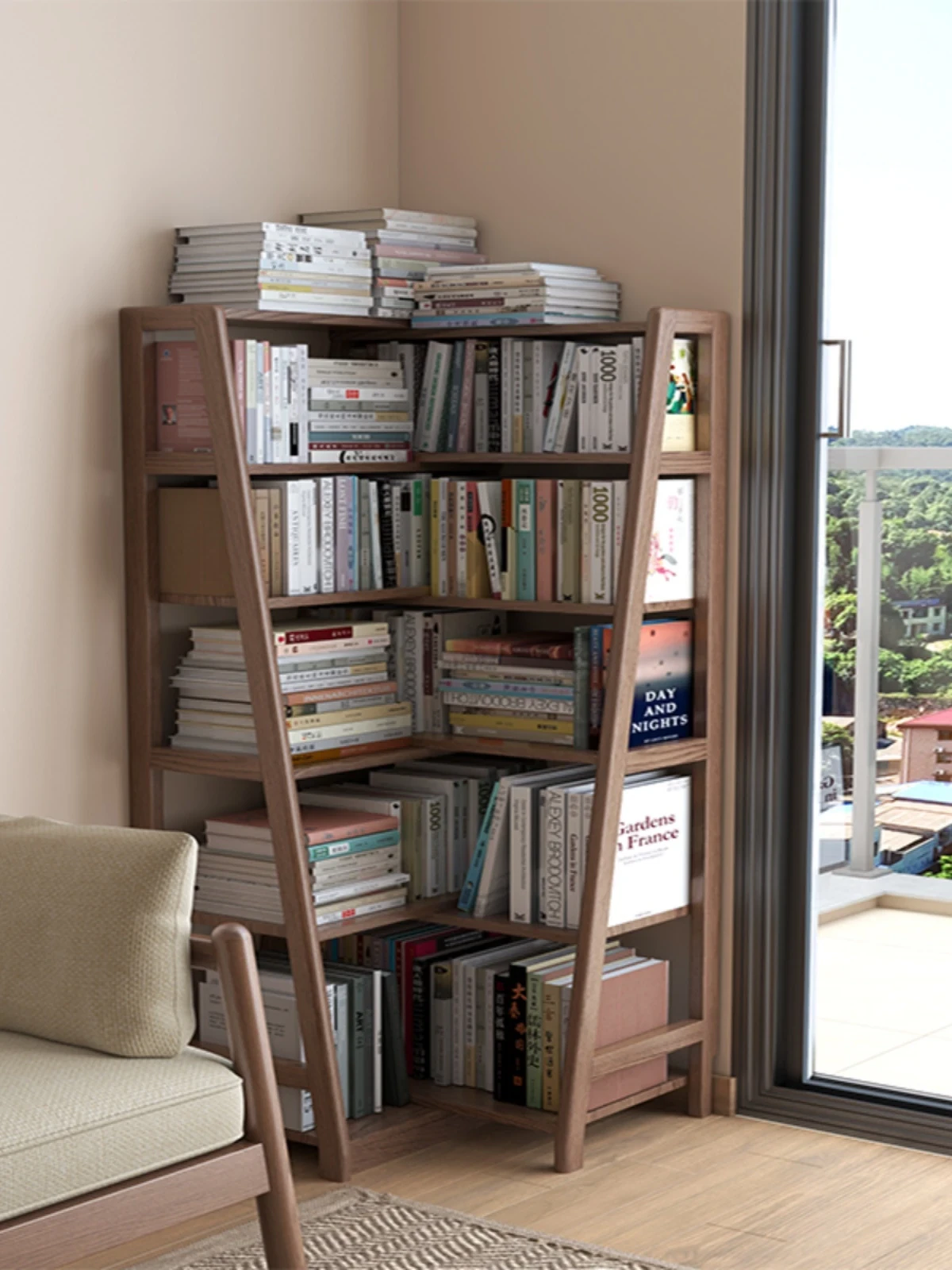 Elegant Solid Wood Corner Bookshelf - Stylish Floor Storage Rack for Living Room, Perfect Corner Cabinet for Efficient Space Saving and Organization.