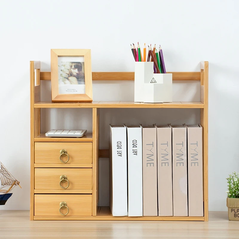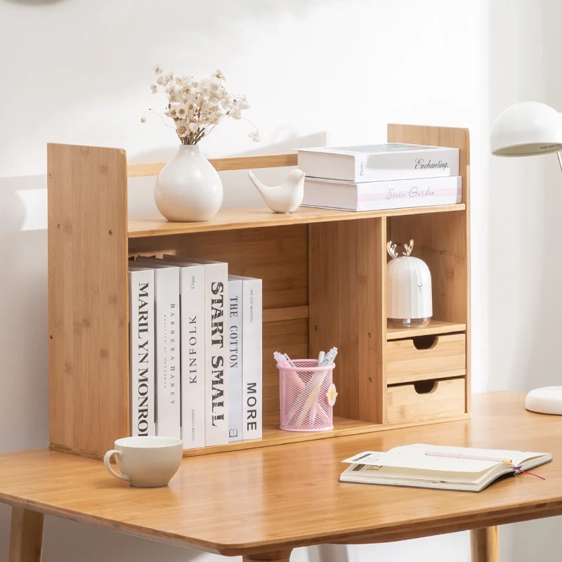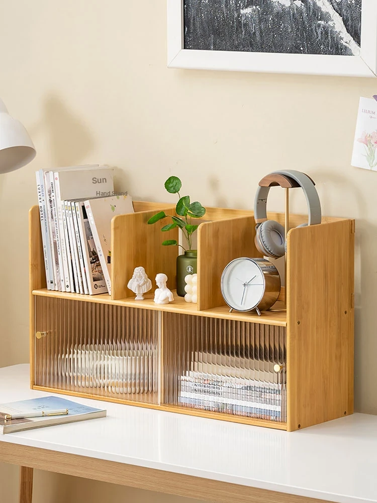 "Stylish Japanese Minimalist Desktop Bookshelf - Office Desk Storage Organizer for Home, Simple Wooden Book Rack, Perfect for Decluttering Your Workspace"