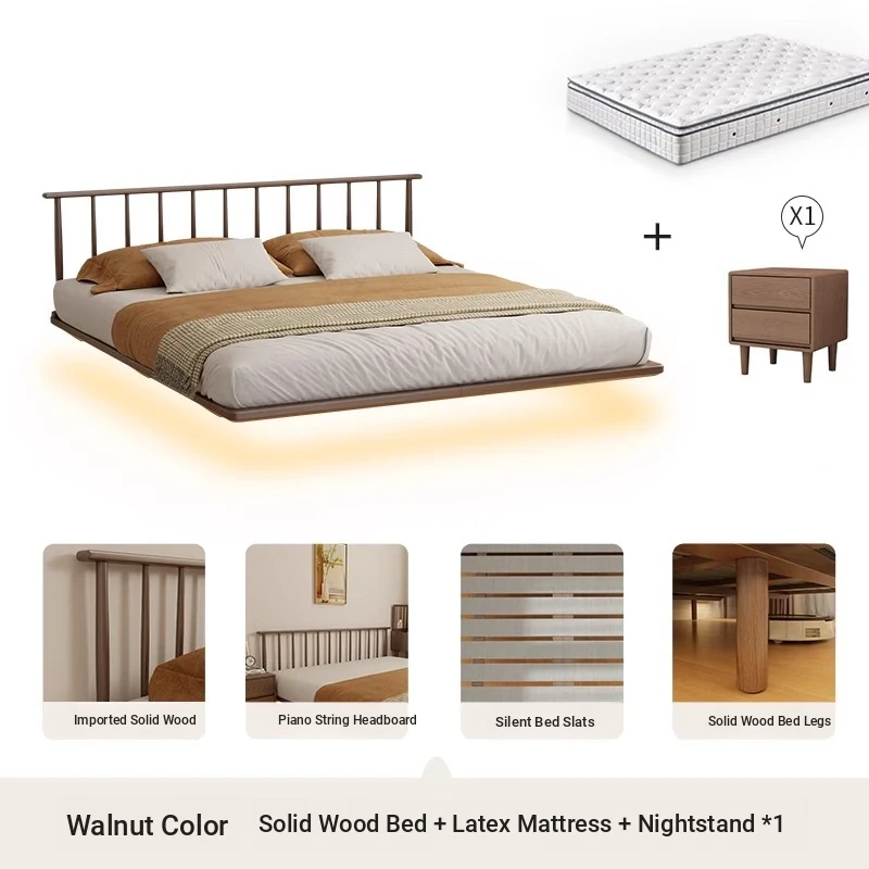 Solid wood bed (walnut color) + bedside table + latex mattress-send light Belt