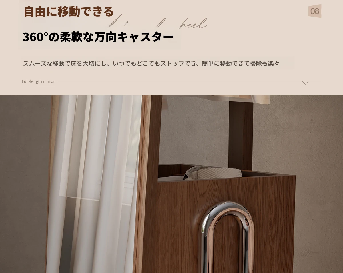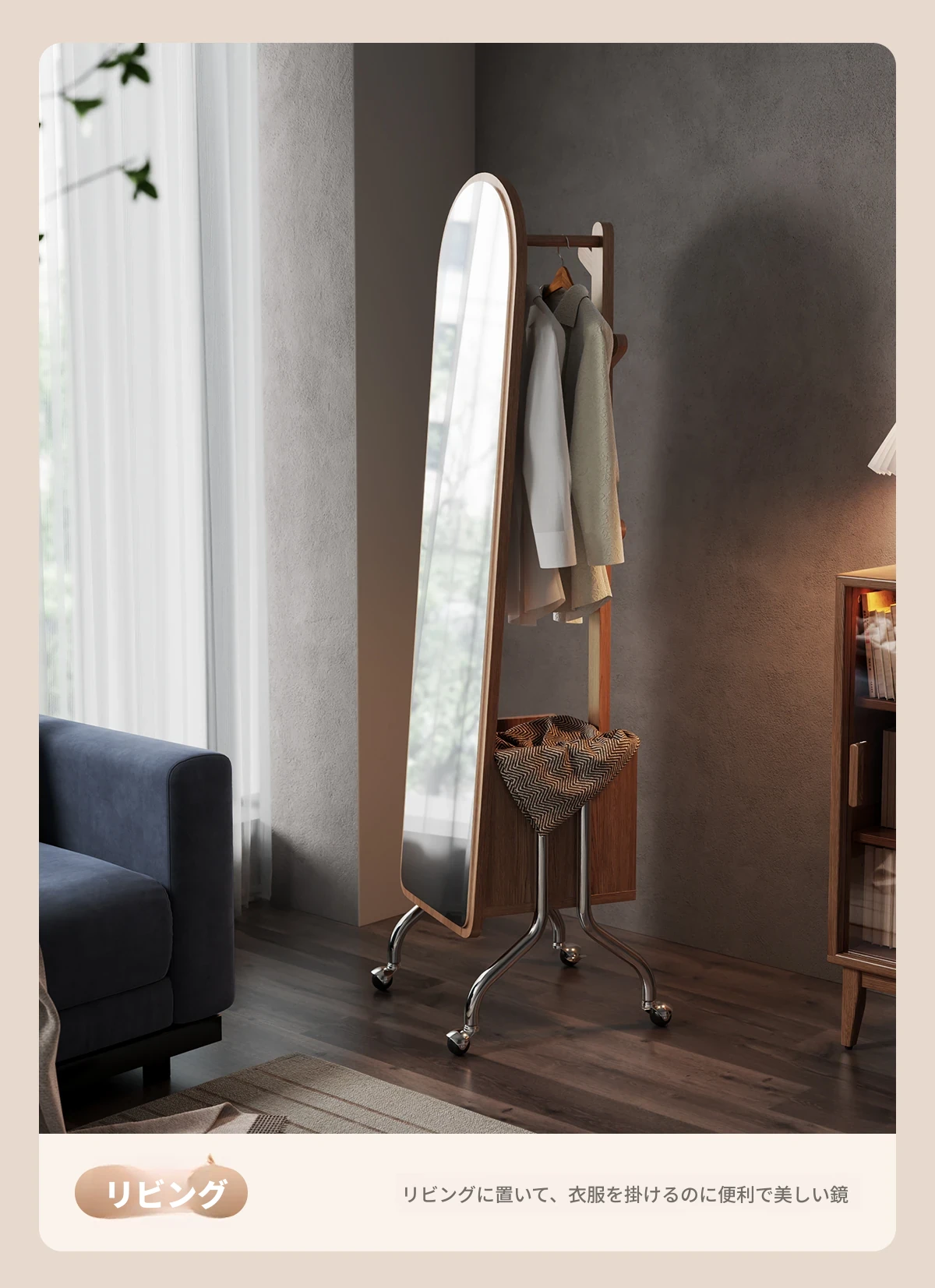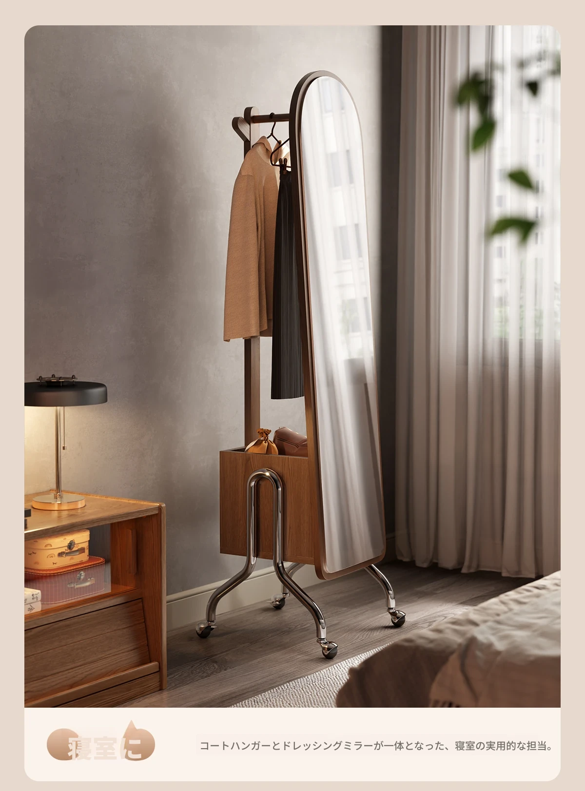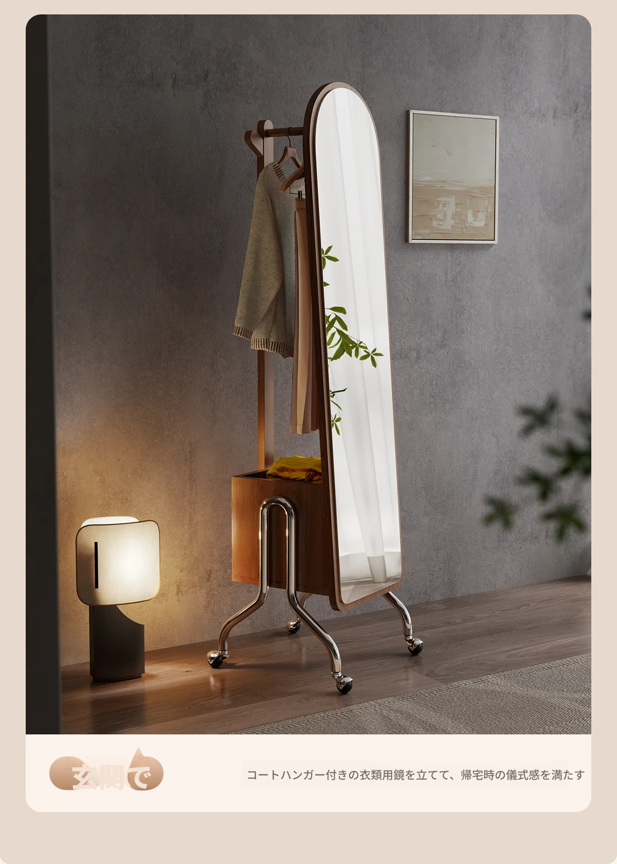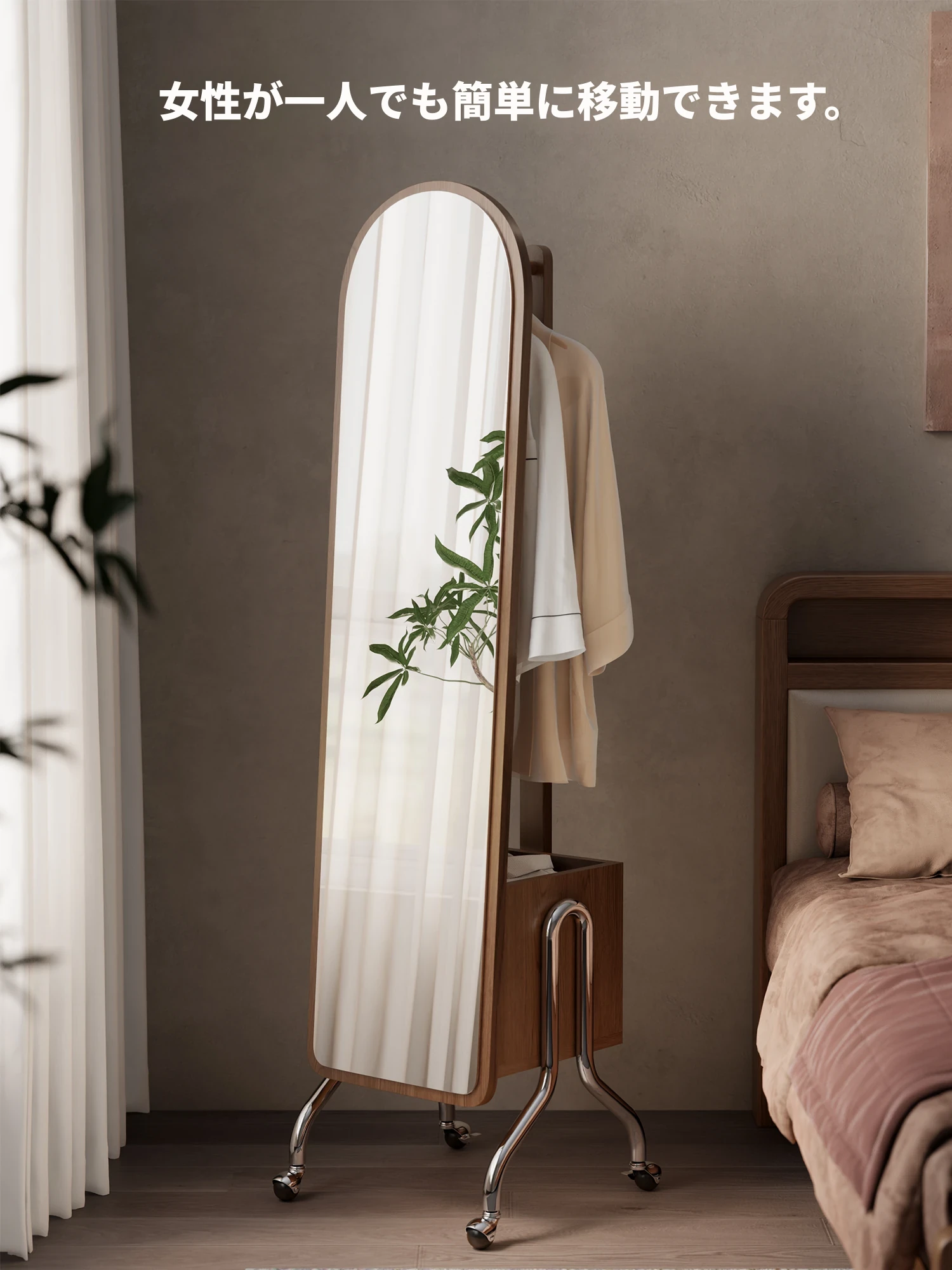 移動式コートハンガー&鏡一体型!女性のための寝室にぴったりな回転式全身鏡付き衣類収納。おしゃれで機能的なデザインで、家でのスタイルをアップグレード!