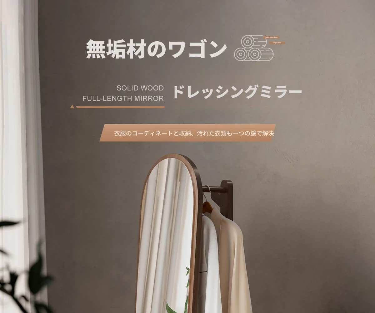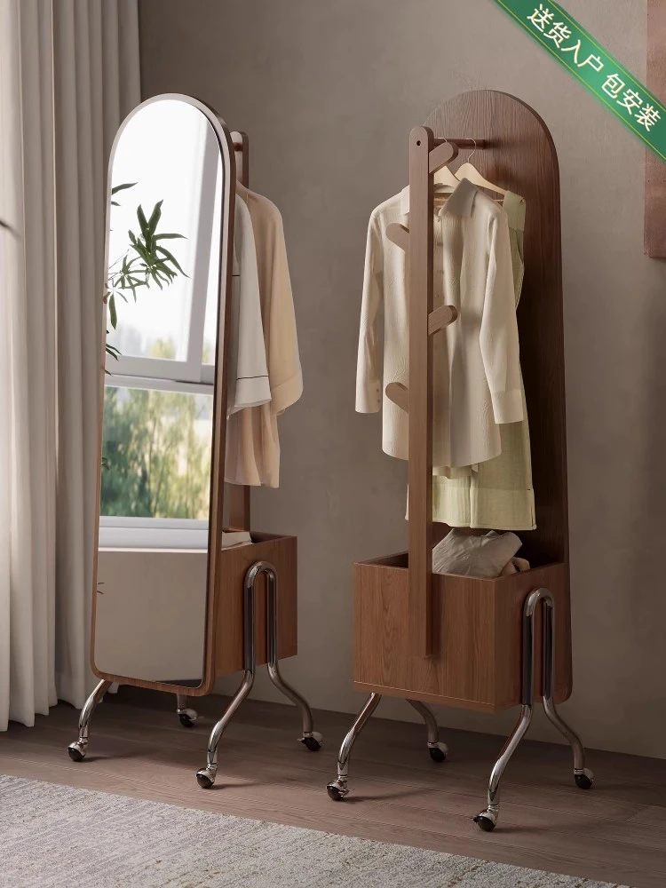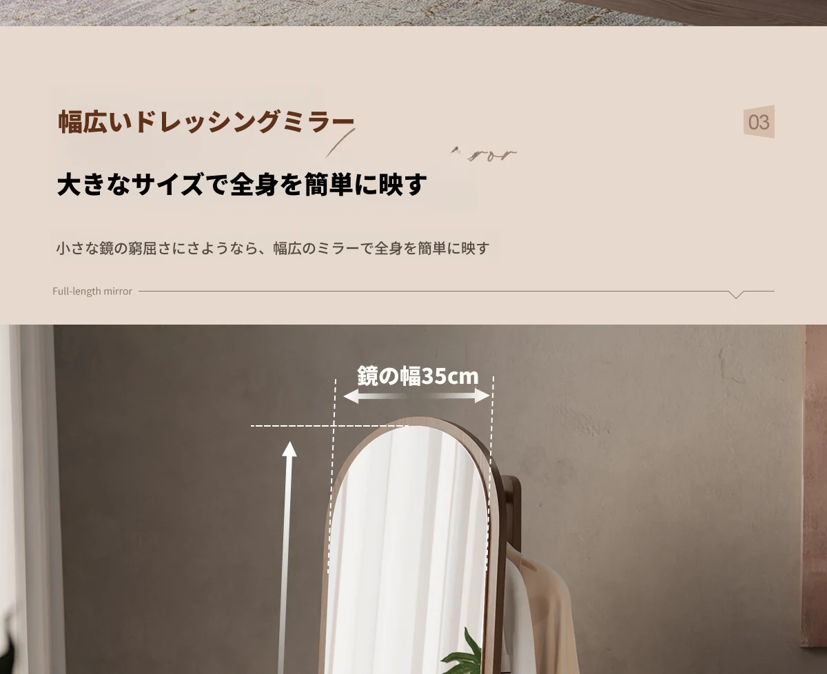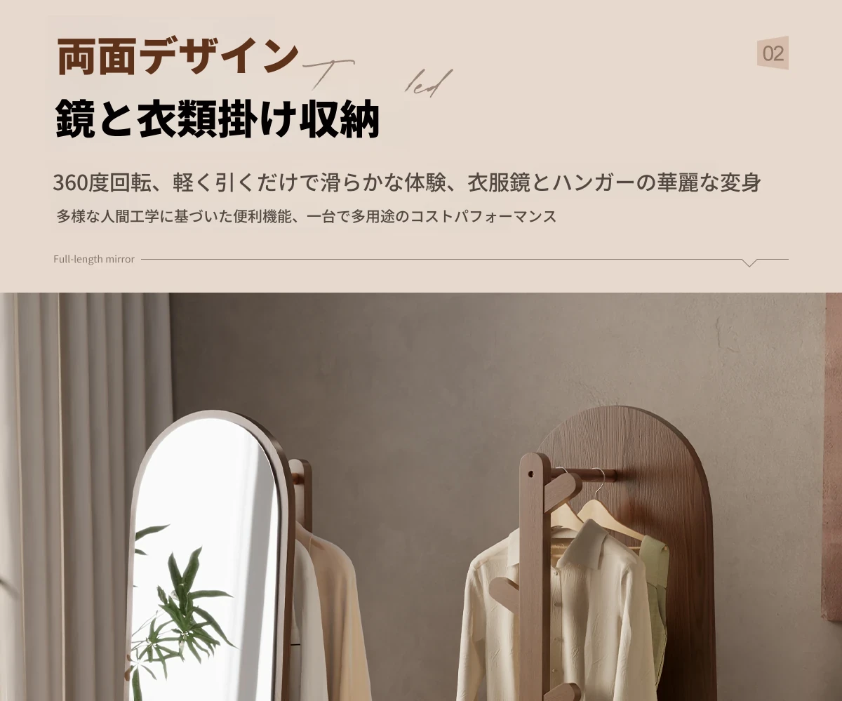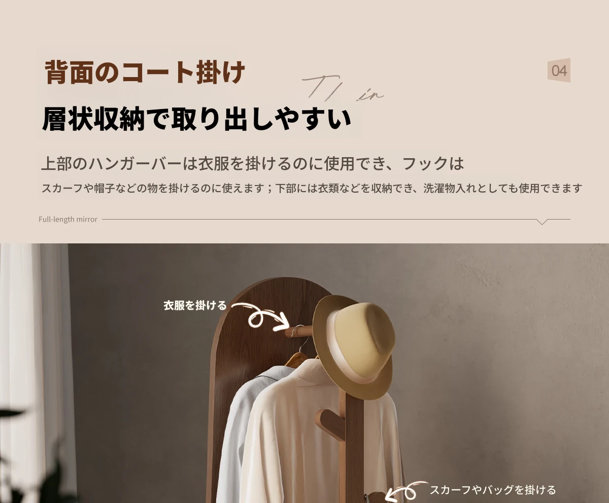 移動式コートハンガー&鏡一体型!女性のための寝室にぴったりな回転式全身鏡付き衣類収納。おしゃれで機能的なデザインで、家でのスタイルをアップグレード!